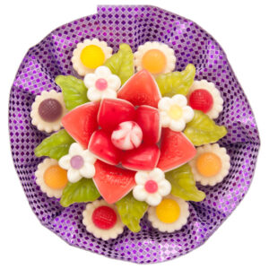 - Kolorowy bukiet z żelków w kształcie kwiatów i liści