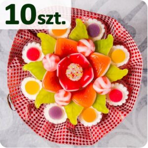 - 10 unikalnych, kolorowych żelków w kształtach kwiatów i liści