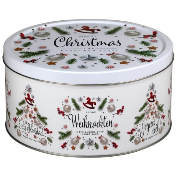 - Elegancka puszka o pojemności 750g z motywami świątecznymi