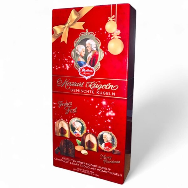Reber Mozart Kugeln to wykwintne praliny czekoladowe pochodzące z Niemiec, które zachwycają miłośników słodyczy na całym świecie. Te eleganckie kulki składają się z delikatnego marcepanu pistacjowego, orzechowego nugatu oraz migdałowego marcepanu, otoczonych cienką warstwą ciemnej i mlecznej czekolady. Ich unikalna kompozycja smakowa sprawia, że są one synonimem luksusu i tradycji w niemieckim cukiernictwie.Idealne na prezent z okazji urodzin, rocznic czy innych wyjątkowych chwil, Reber Mozart Kugeln doskonale komponują się z filiżanką kawy lub herbaty, stanowiąc elegancką przekąskę podczas spotkań towarzyskich. Ich estetyczne opakowanie podkreśla ich ekskluzywny charakter, czyniąc je doskonałym wyborem na prezent dla osób ceniących wysoką jakość i tradycyjny smak.