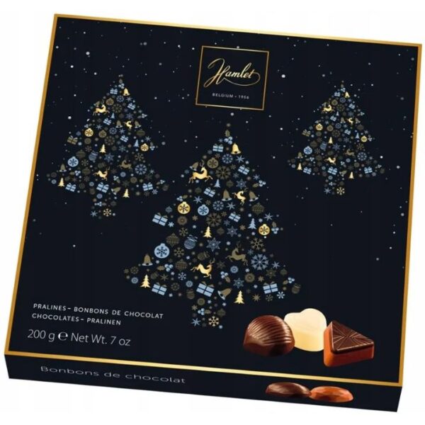 Pralinki Hamlet choinki BLACK to wyjątkowy zestaw belgijskich czekoladek w kształcie choinek, które wprowadzą Cię w świąteczny nastrój. W eleganckim opakowaniu o wadze 200g znajdziesz różnorodne smaki: białą, mleczną i ciemną czekoladę z nadzieniem waniliowym, czekoladowym, karmelowym, pistacjowym, orzechowym, pomarańczowym lub truskawkowym. Każda pralinka jest starannie wykonana, co gwarantuje wysoką jakość i estetyczny wygląd. Produkt jest w 100% bezalkoholowy, co sprawia, że jest odpowiedni dla wszystkich.